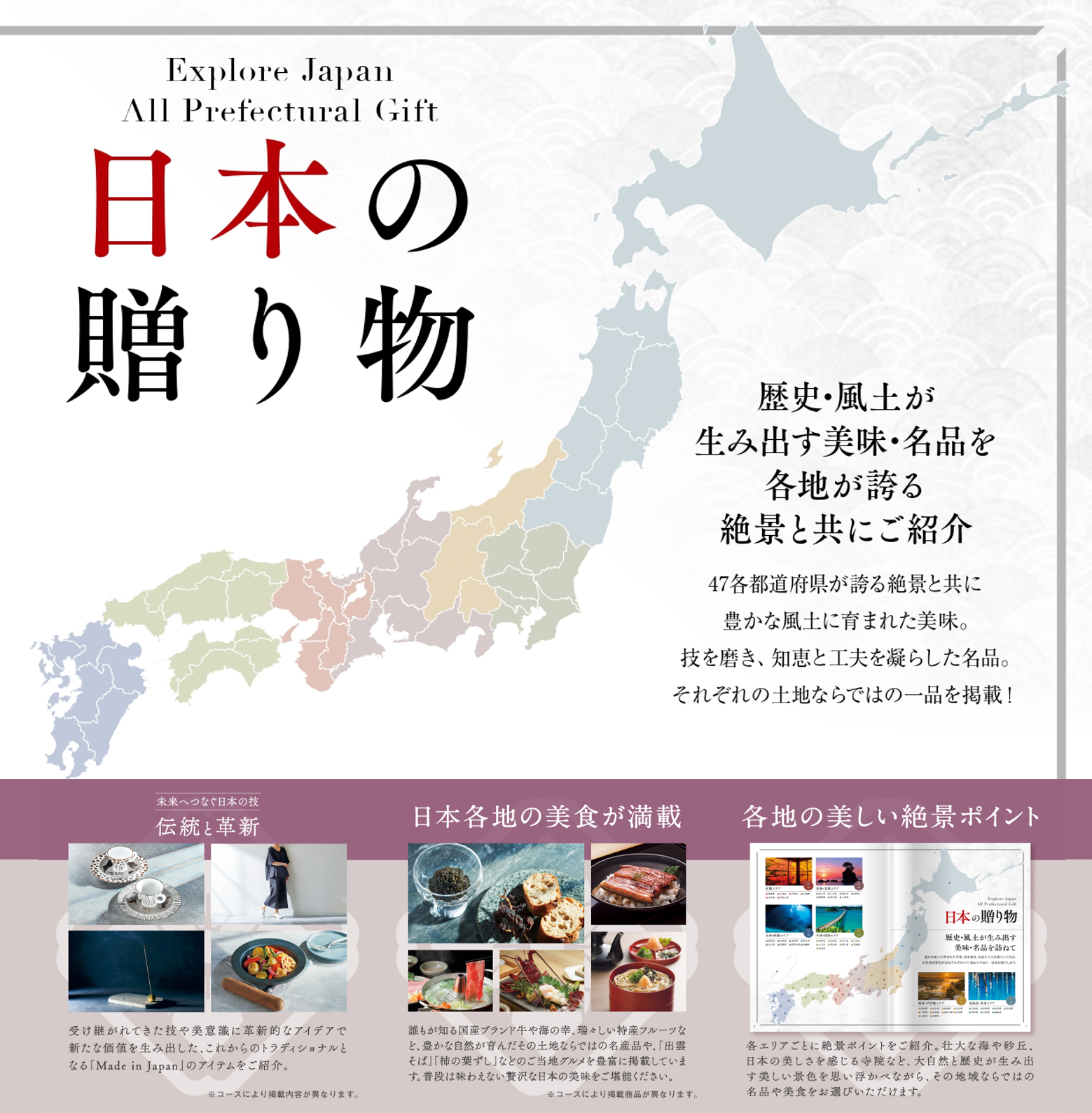 誰もが知る国産ブランド牛や海の幸、瑞々しい特産フルーツなど、豊かな自然が育んだその土地ならではの 名産品や、「出雲そば」「柿の葉ずし」などのご当地グルメを豊富に掲載しています。普段は味わえない贅沢な日本の美味をご堪能ください。