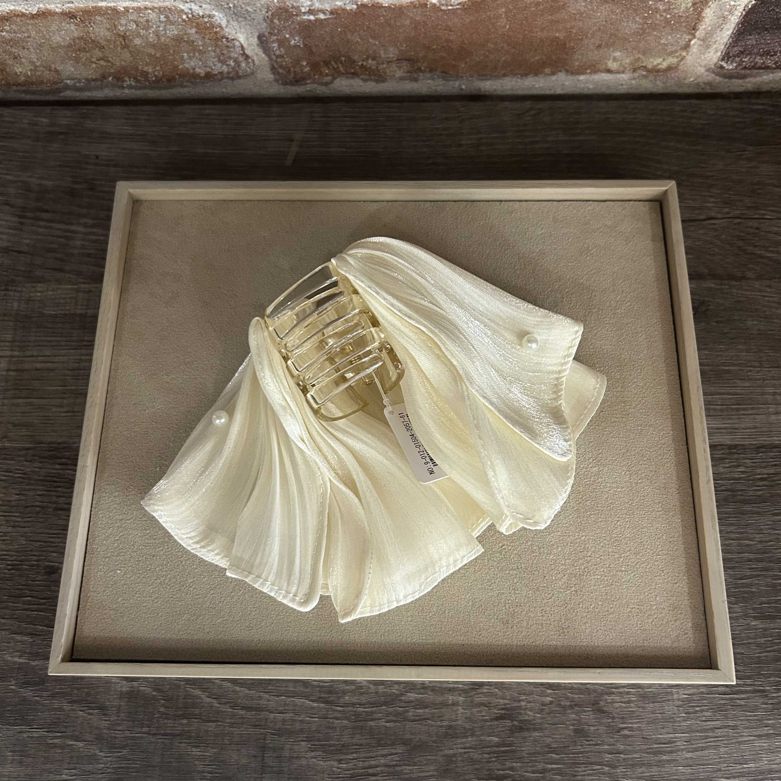 パールが散りばめられた、サテン生地のサーキュラー風(フリルデザイン)バンスクリップ。
