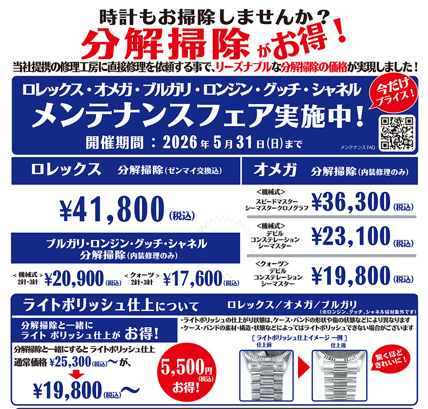 ロレックス・オメガ・ブルガリ・ロンジン・グッチ・シャネル メンテナンスフェア 今だけプライス!