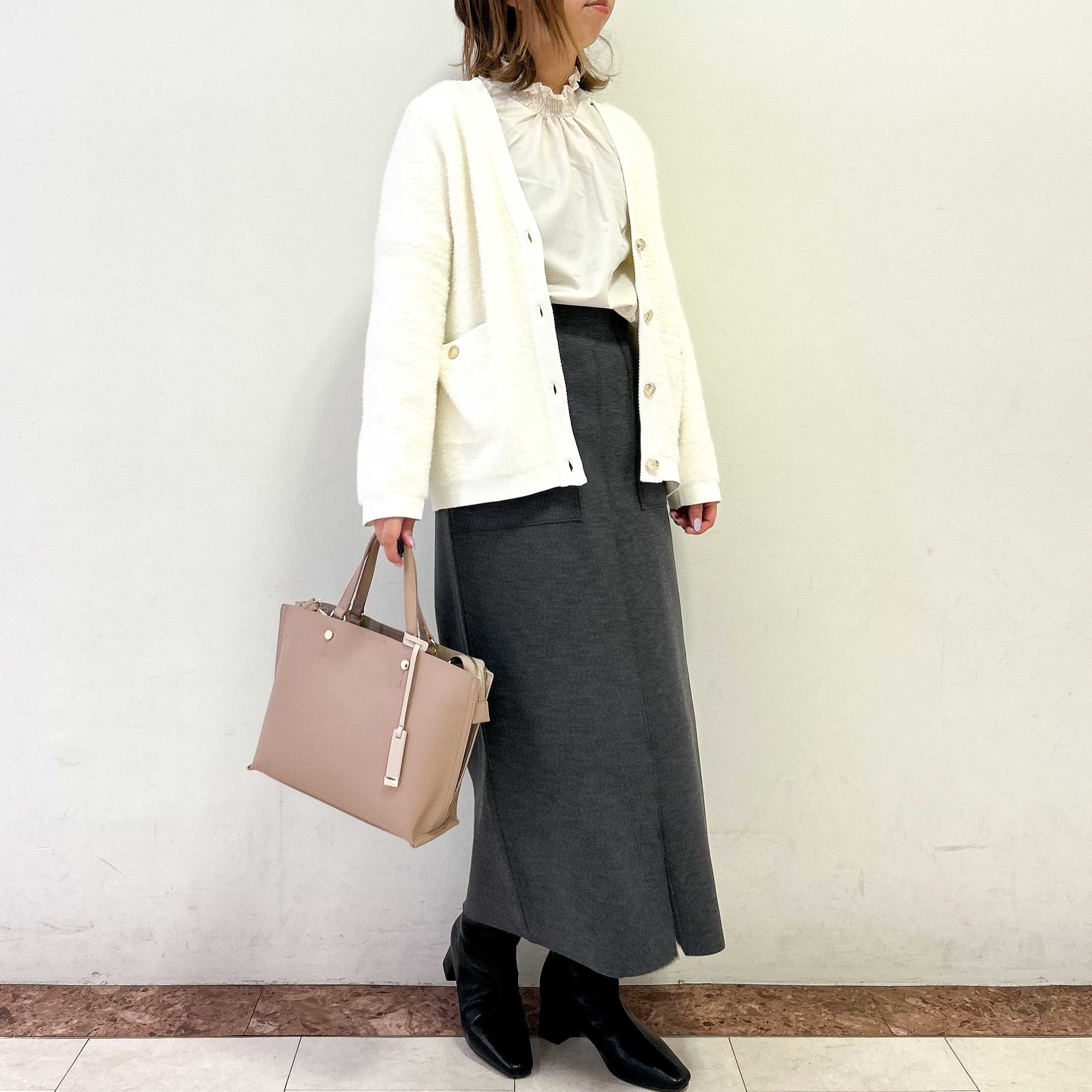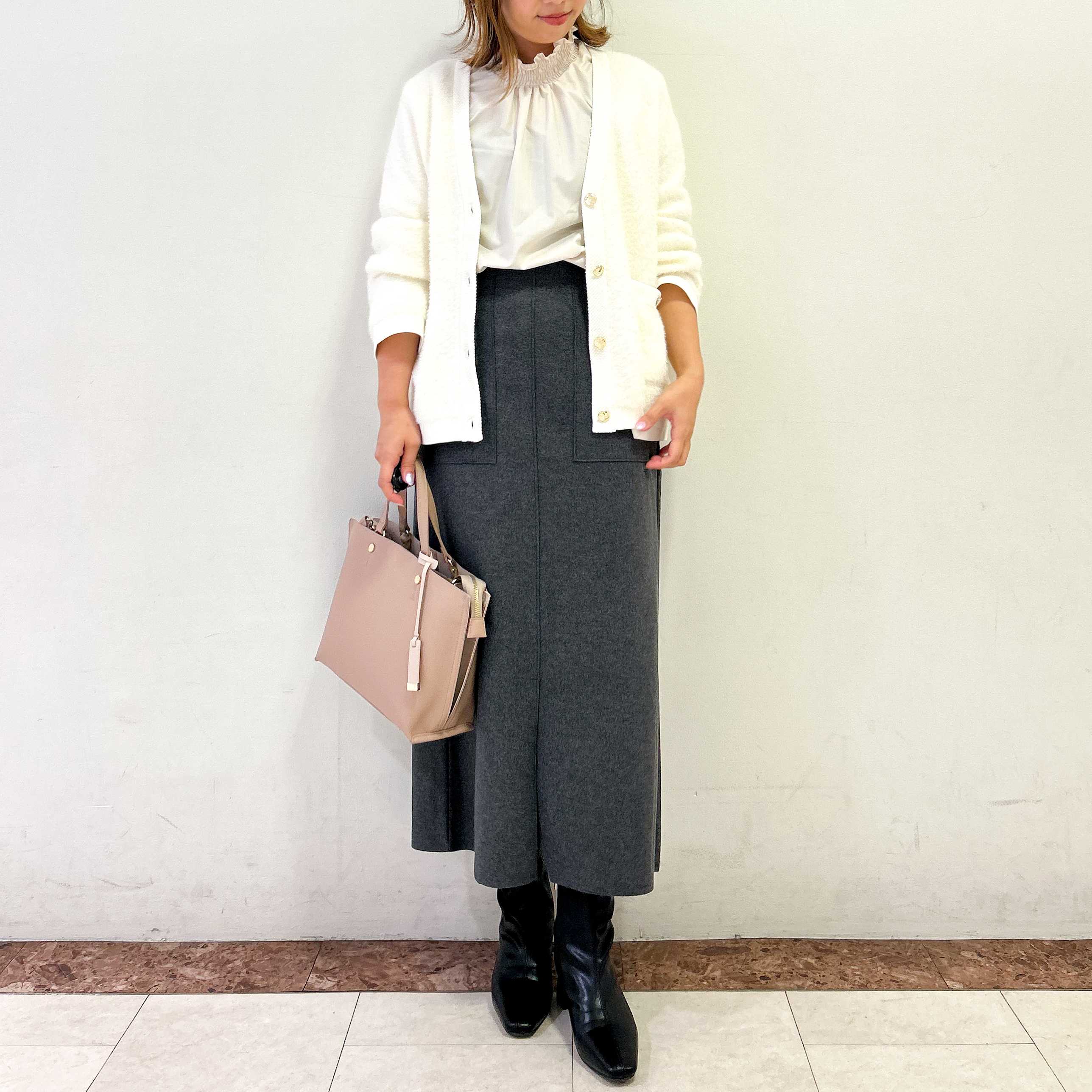 ・腰に掛かるくらいの着丈で、スカートにもパンツにもバランス良くスタイリングが可能です。
