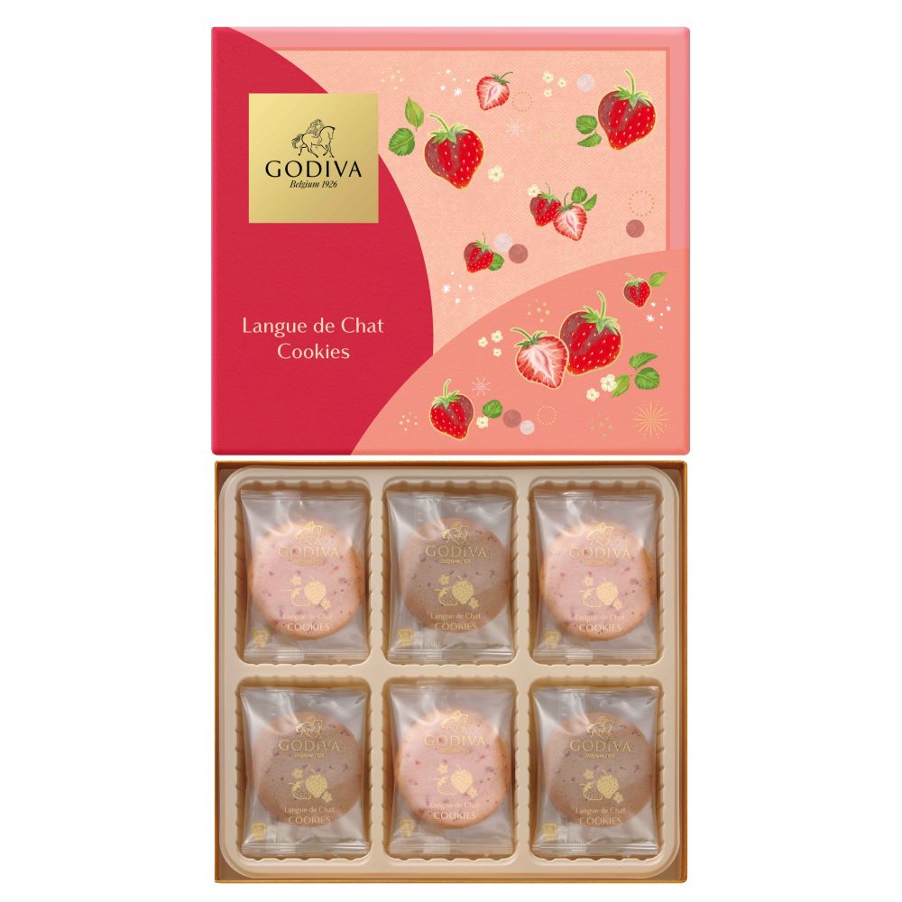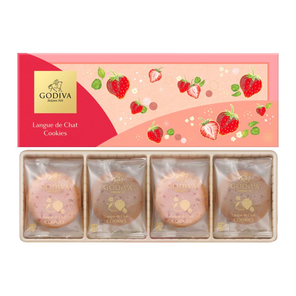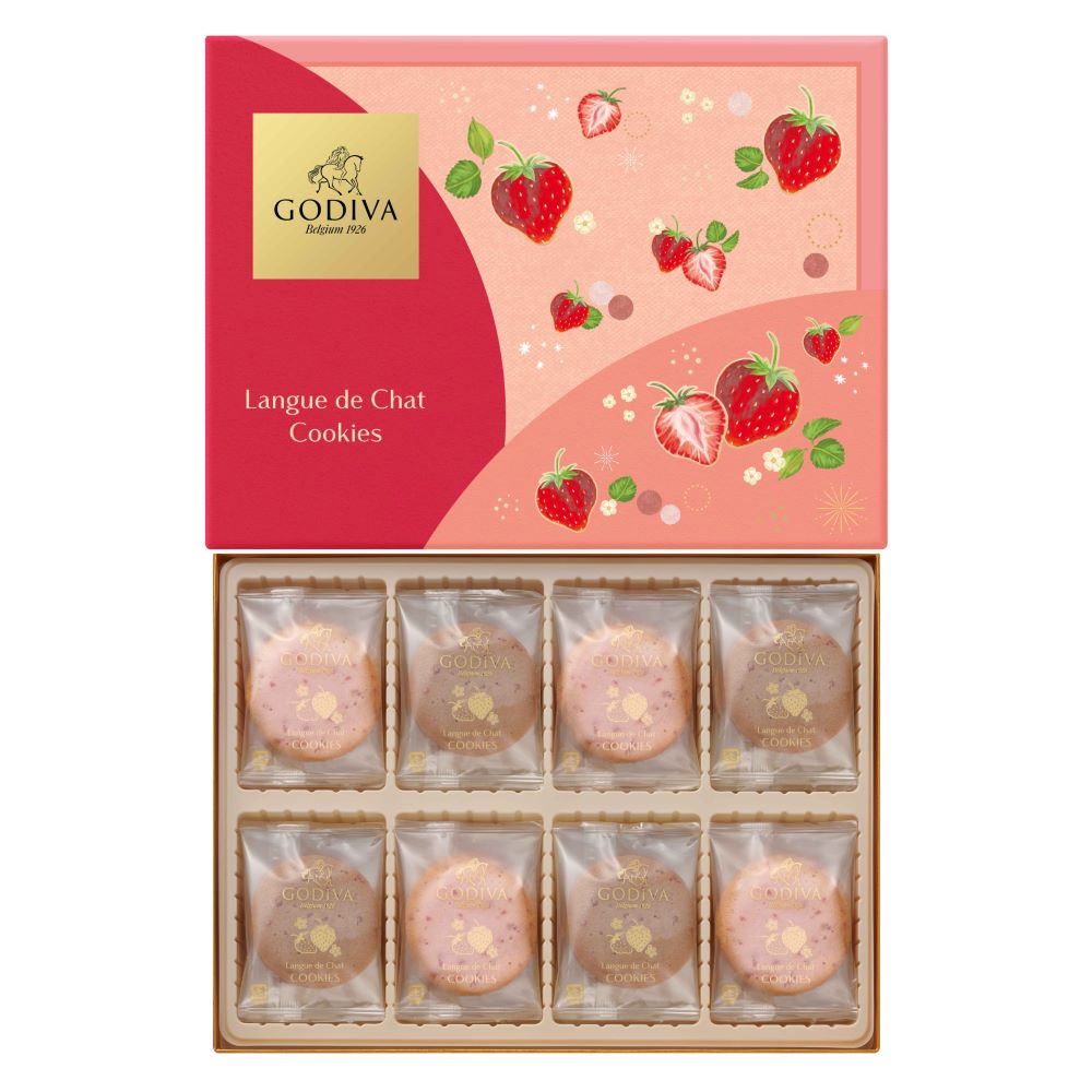 あまおう苺パウダーを練り込んだ甘酸っぱいホワイトチョコレートを、ミルクチョコレートが溶けこんだラングドシャ生地でサンドしたクッキー。ラングドシャ生地に入ったストロベリーチップが食感のアクセントに。
