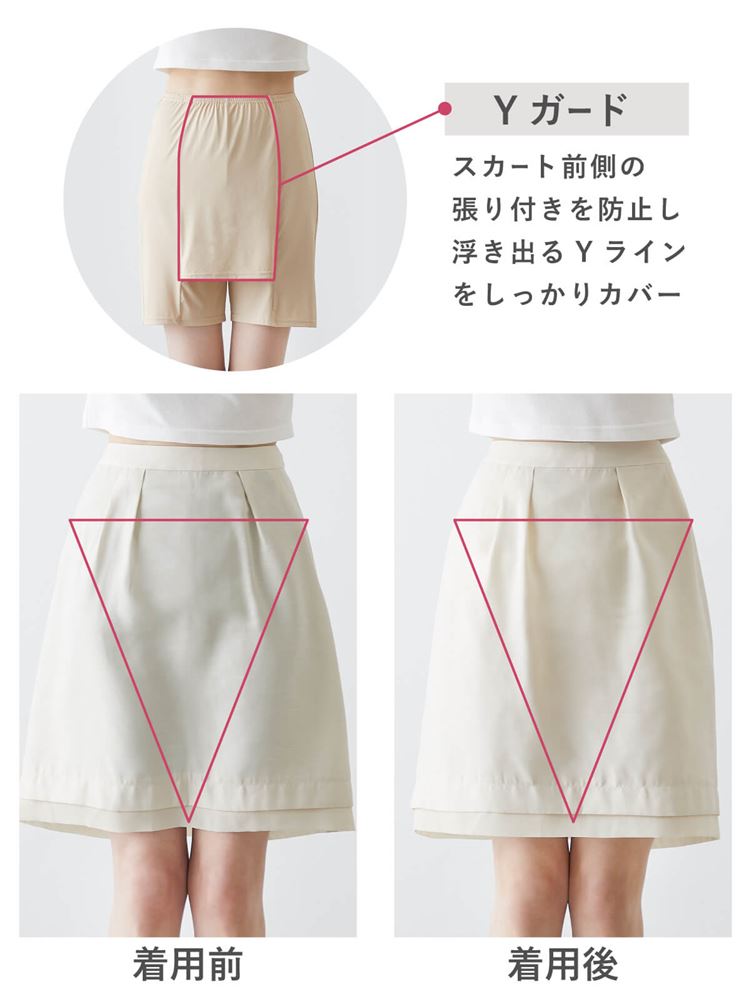 Yライン(股や太ももあたり)部分に前布を付けることで、スカート・ワンピースの張り付きや脚への入り込みを防いでくれる優秀アイテム。