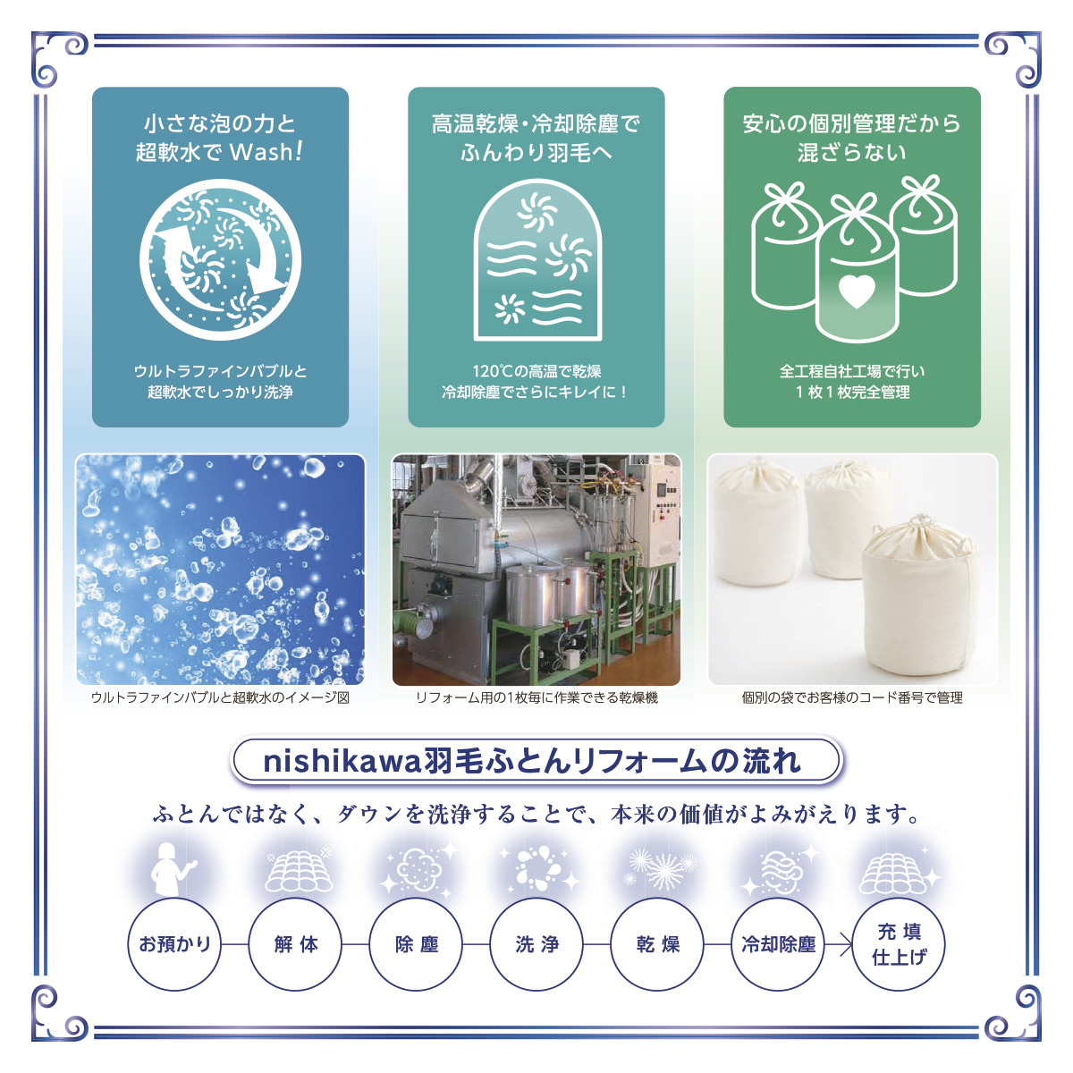 自社工場だからこそのこだわり。安心の個別管理、ウルトラファインバブルと超軟水で洗浄、高温乾燥でふんわり羽毛へ。他店でご購入した羽毛ふとんも承ります。
