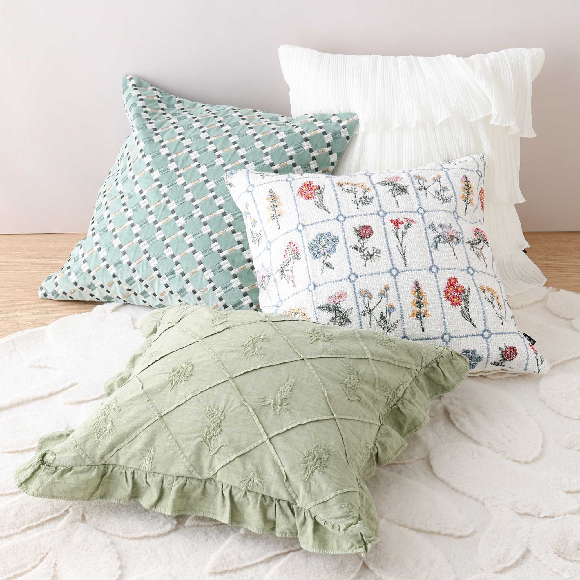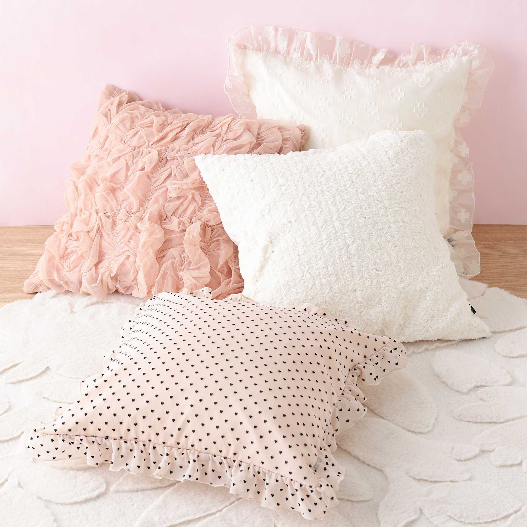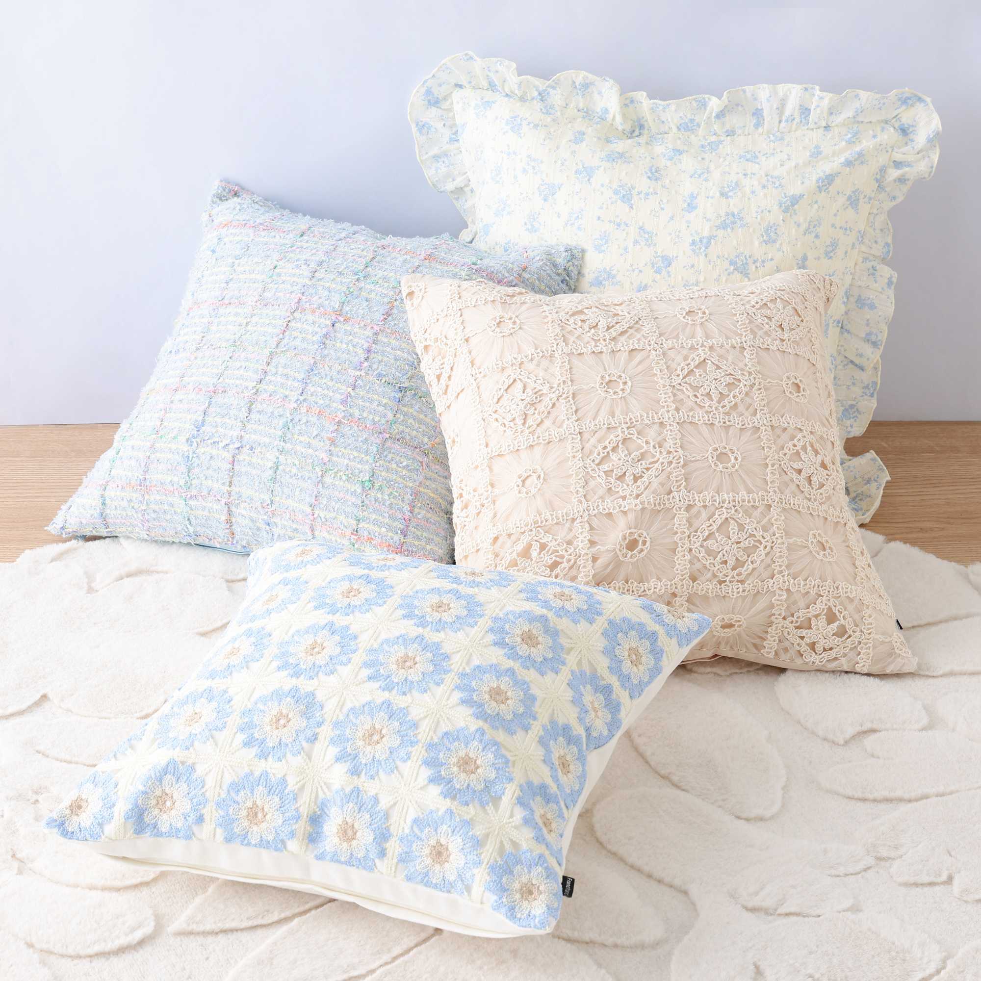 チュールやオーガンジー、ツイードといった柔らかい素材や、明るいカラー、レースやお花のモチーフをふんだんに使用したクッションカバーが新登場✨