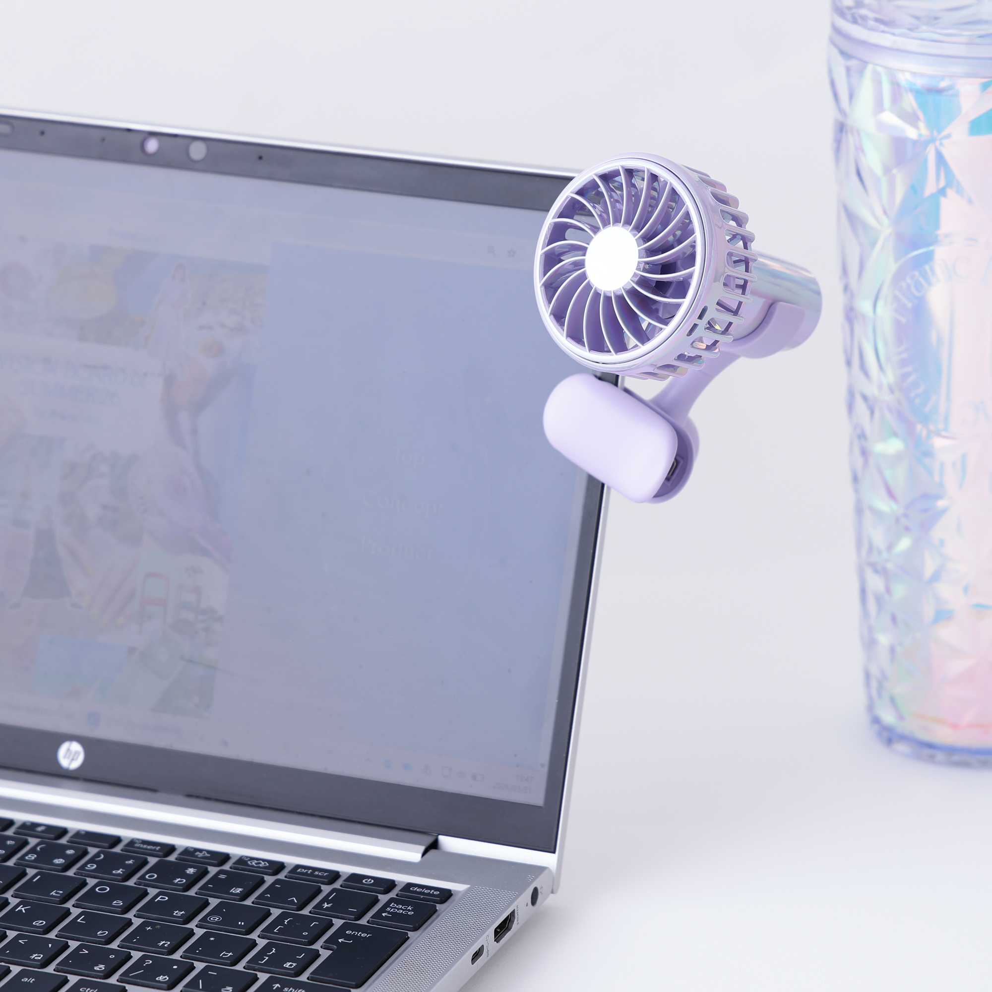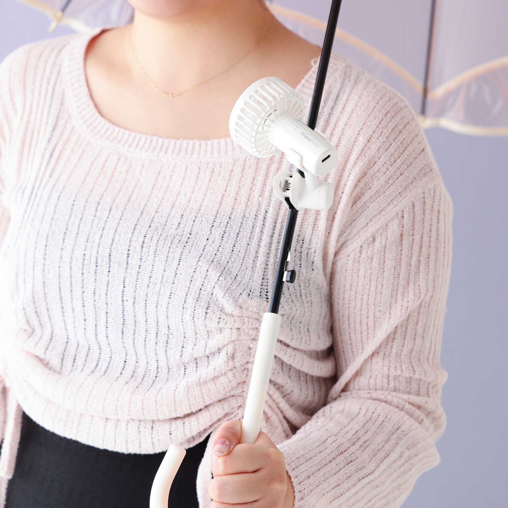 付属のクリップで日傘やバックなど、さまざまな場所に取り付けたり、付属のネックストラップを付けて首から提げるとハンズフリーで使うことができます◎