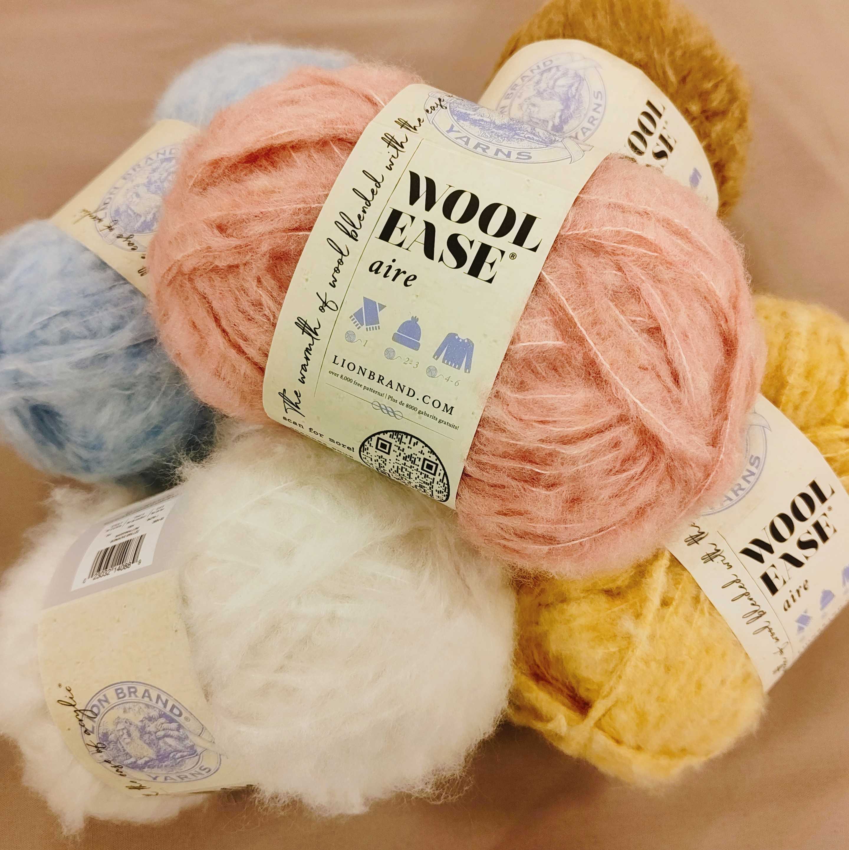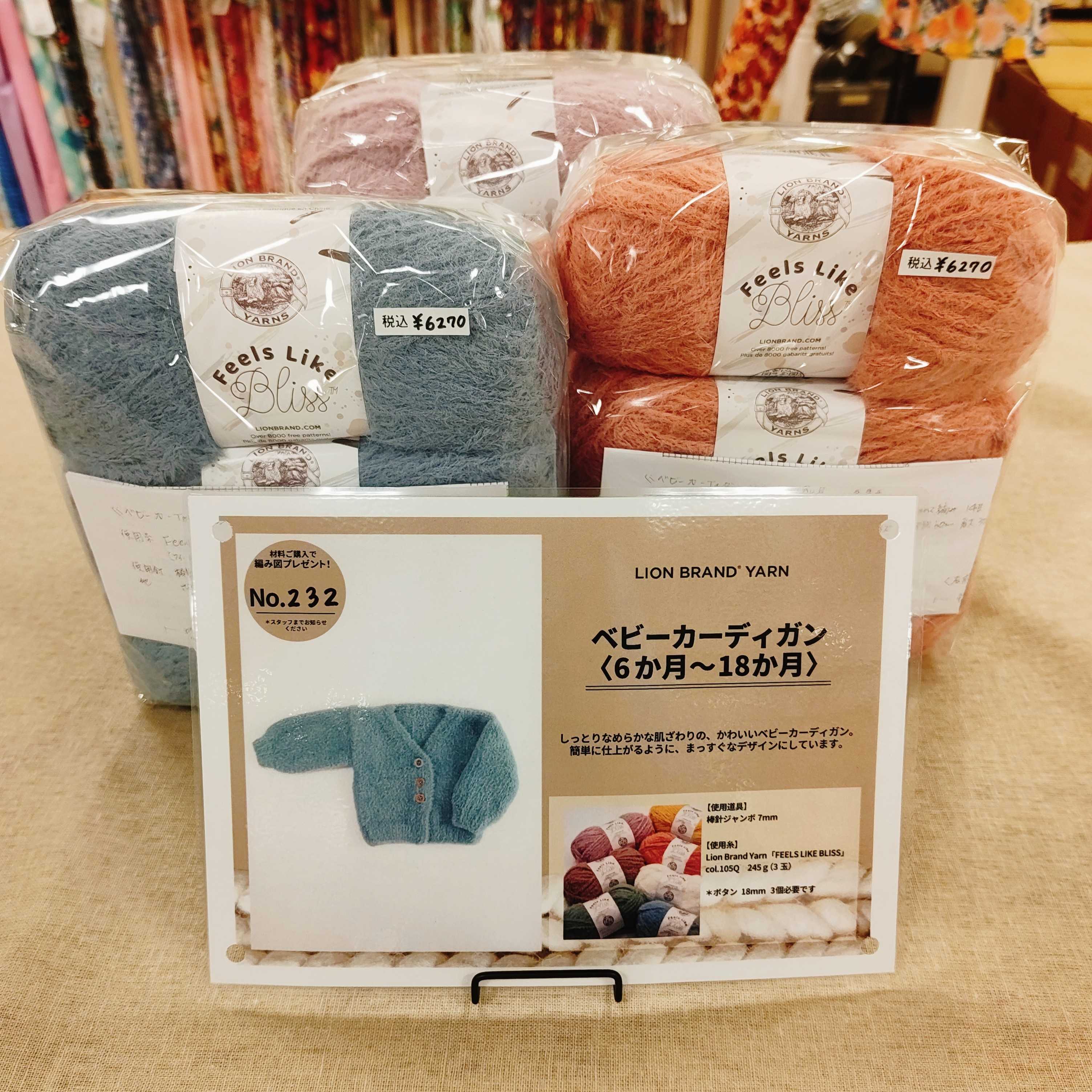 Feels Like Blissは3玉で編めるベビーカーディガンの編み図を、WOOL EASE AIREは1玉で編めるマフラーの編み図をご用意しています。