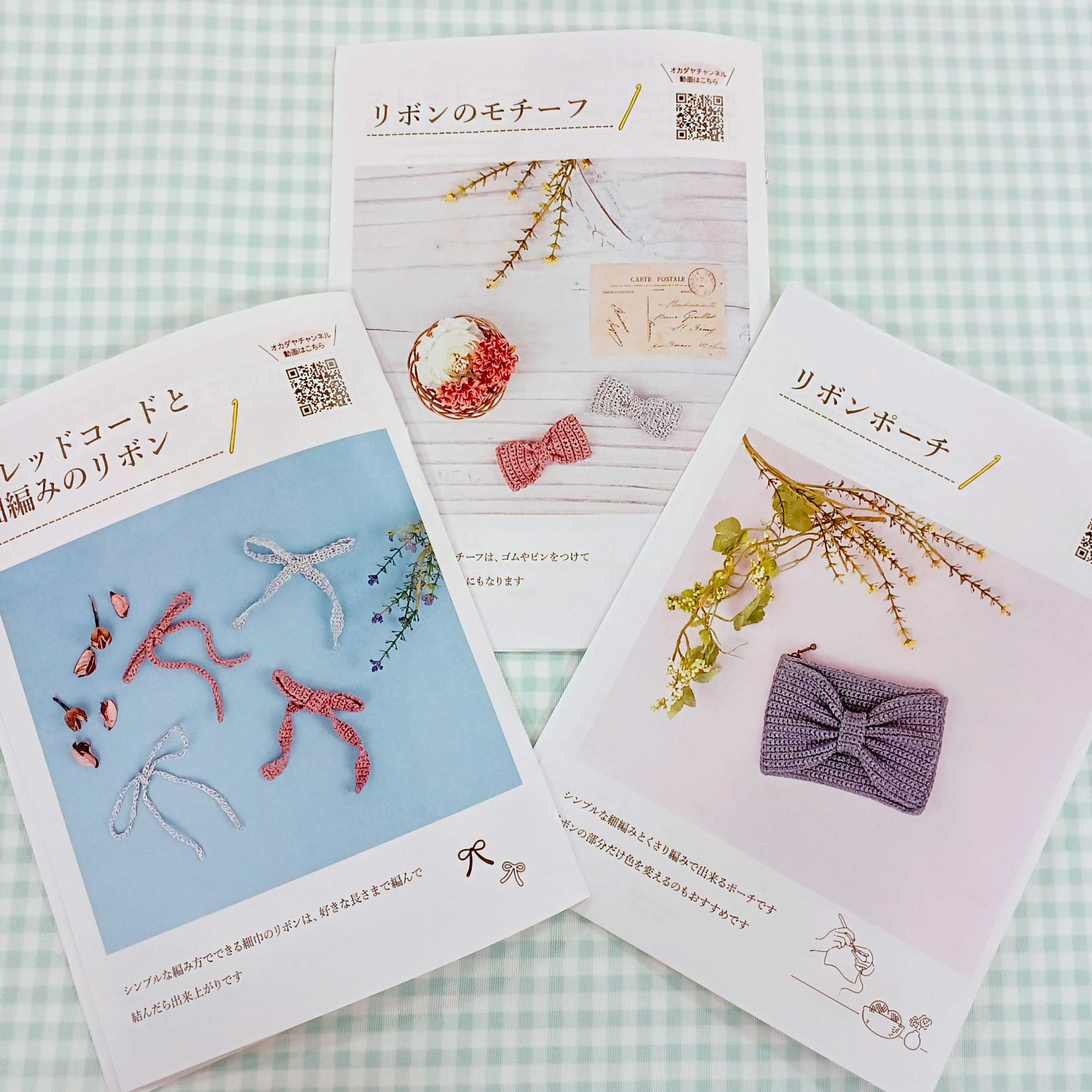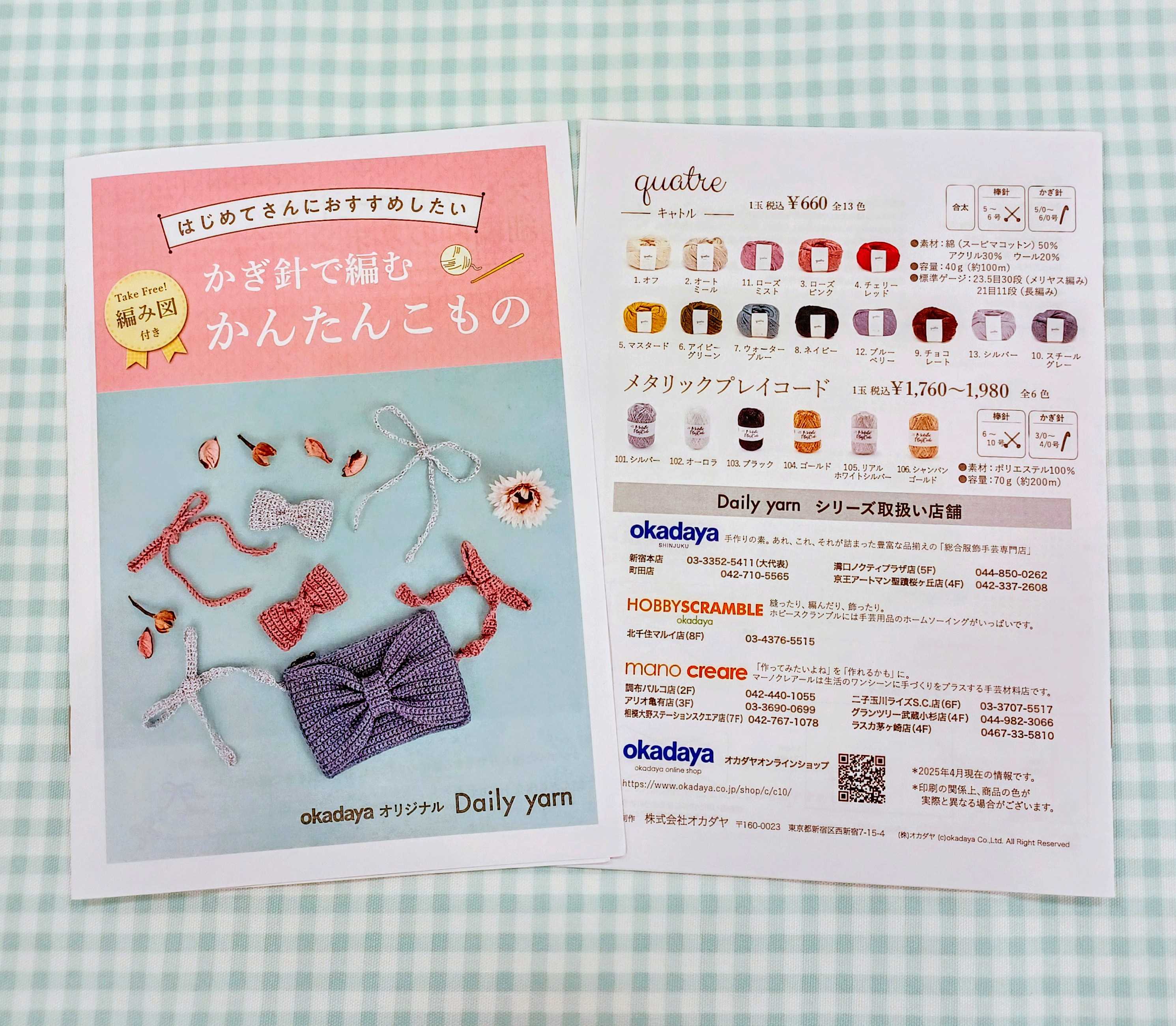 2025年のオカダヤオリジナル毛糸フラッフィーロービングのお花モチーフが編めるカラーレシピ掲載の小冊子も無料配布中。講習会へのご参加が難しいお客様もぜひお気軽にお立ち寄りくださいませ♪
