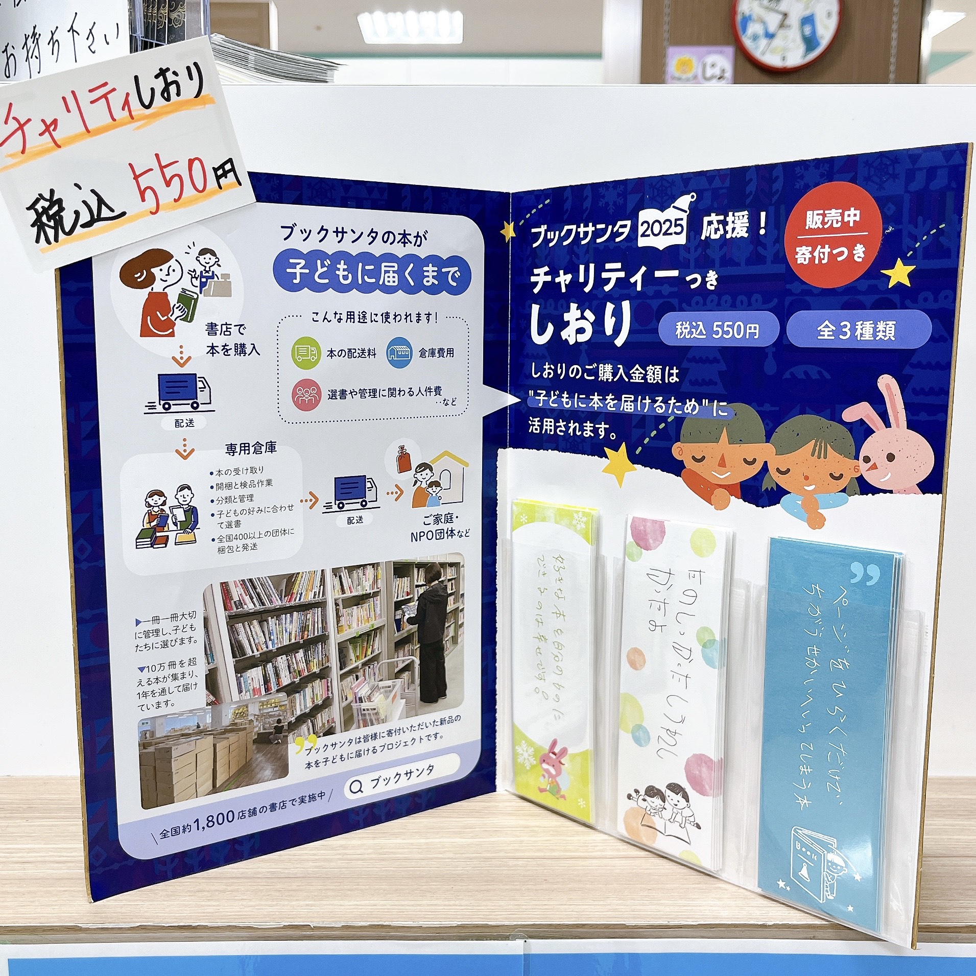 さらに今年はブックサンタの活動を応援することができる「チャリティーつきしおり」の販売もございます。