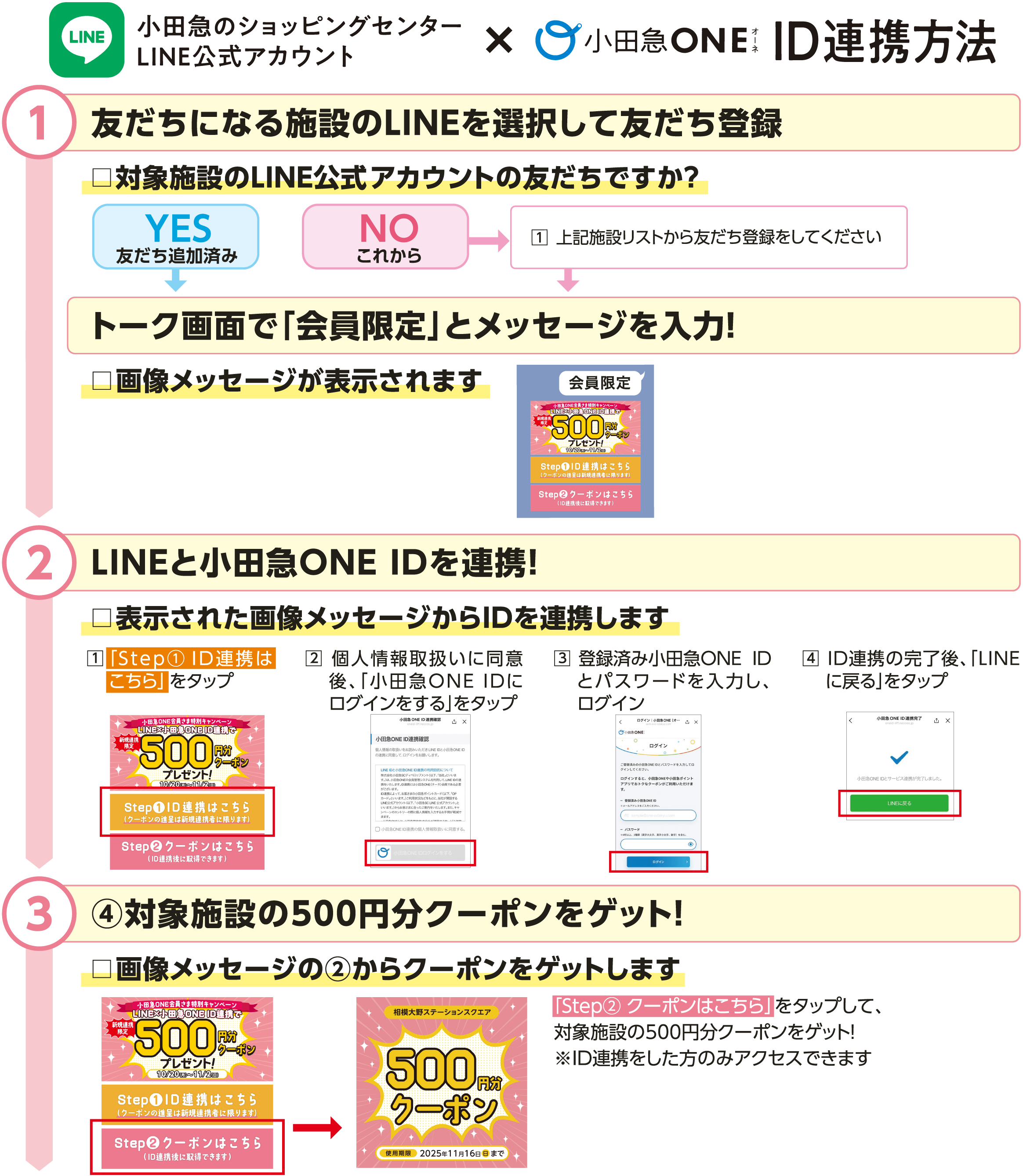 小田急ONEに関する詳細はこちら各ショッピングセンターの公式LINEとお客さまの「小田急ONE ID」を紐づけるものです。