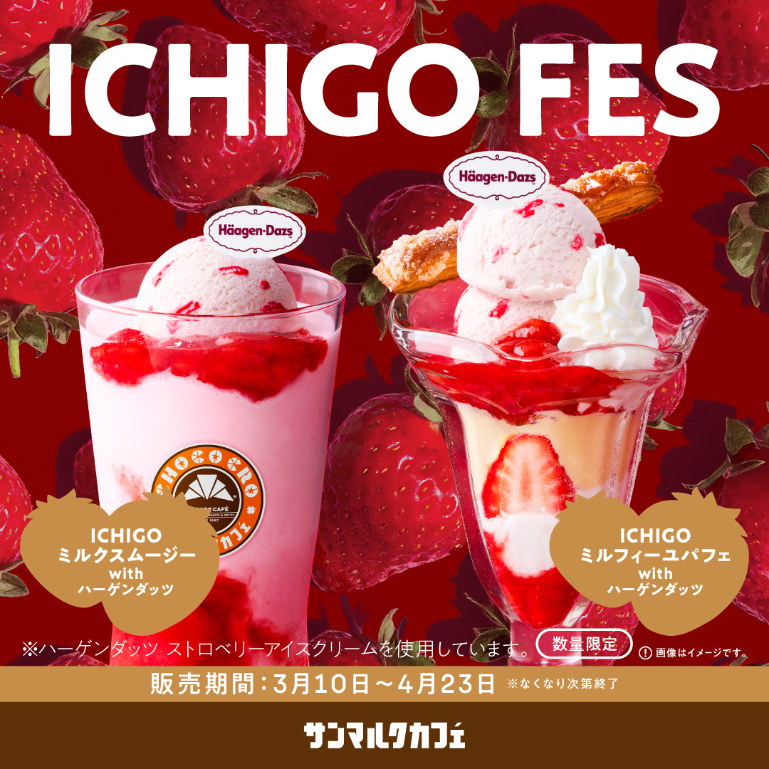いつもサンマルクカフェをご愛顧いただきありがとうございます!いちごづくしのプレミアムなチョコクロに加え、ハーゲンダッツとのタイアップ第2弾となる、ハーゲンダッツ ストロベリーアイスクリームを贅沢に使用したスムージーとパフェが登場いたします。
